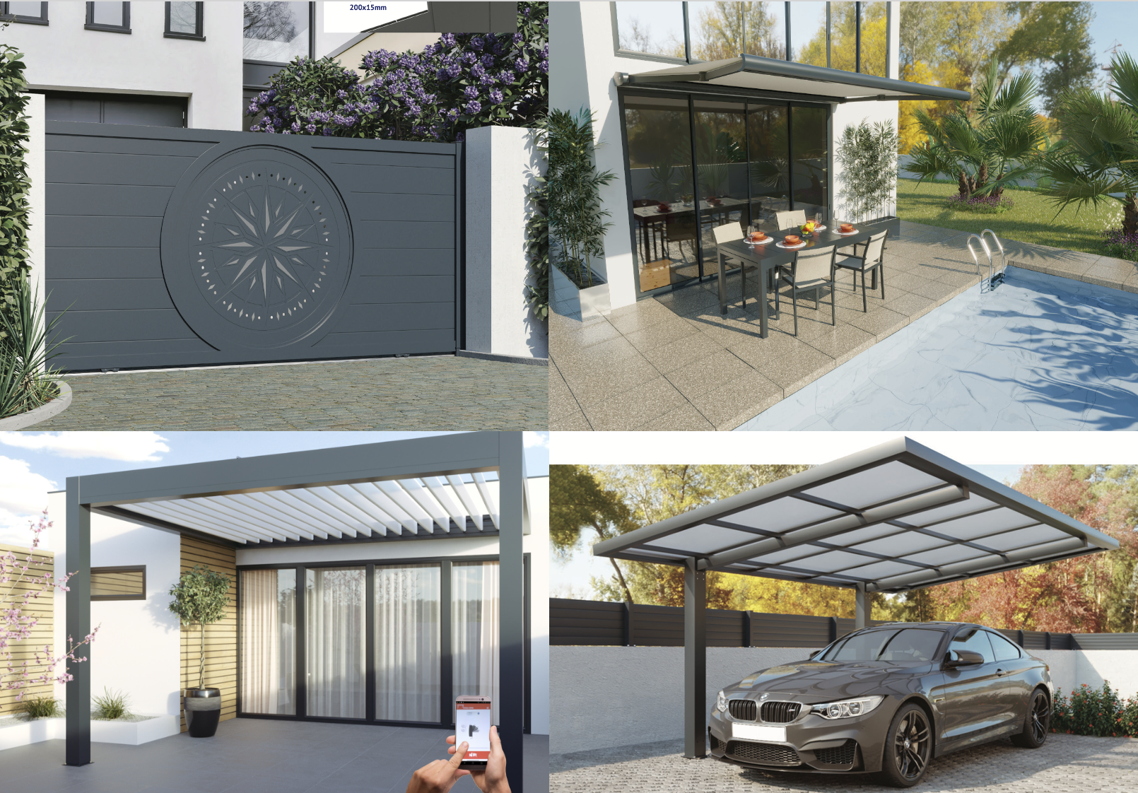 Que ce soit pour votre portail, pour votre clôture, pour votre pergola, un projet de carport voiture ou camping-car, un garage, un abri pour votre Spa, vous créer une cuisine extérieure ou juste pour votre mobilier de jardin, choisir l’aluminium fait de votre choix un gage de qualité et de durée de vie dans le temps. Ce matériau est 100% recyclable, resiste aux agressions du temps qui passe et reste à la fois contemporain et intemporel. Les finitions de ces produits sont du plus bel effet et vous apporterons satisfaction, vous serez fiers de les montrer à votre entourage.