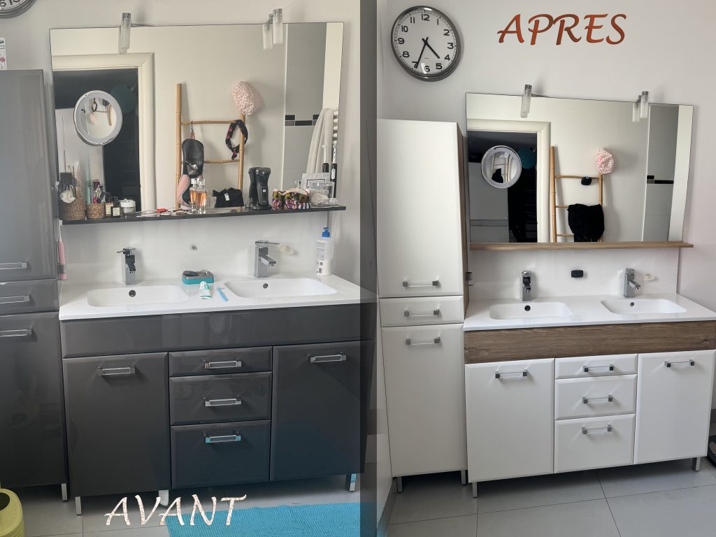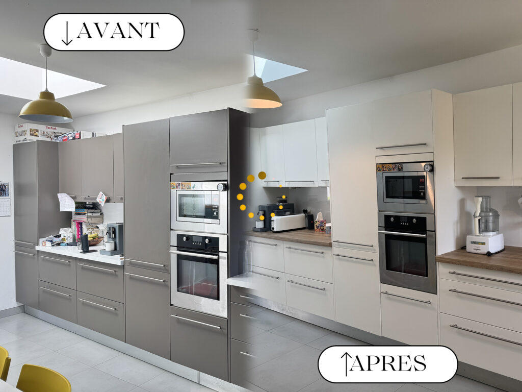 Cette technique permet de moderniser des portes et éléments de cuisine, plan de travail, murs, meubles, portes intérieures, banque d’accueil, comptoir, bar, table… en bref, c’est quasi sans limite.